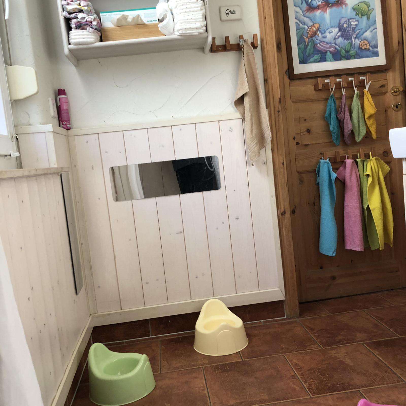 Im Eingangsbereich haben die Kinder eine eigene Kindergarderobe. Dort können wir das selbstständige An- und Ausziehen üben. Ebenso steht ein eigenes Bad mit Hygieneartikeln und Zubehör für die Kinder zur Verfügung.